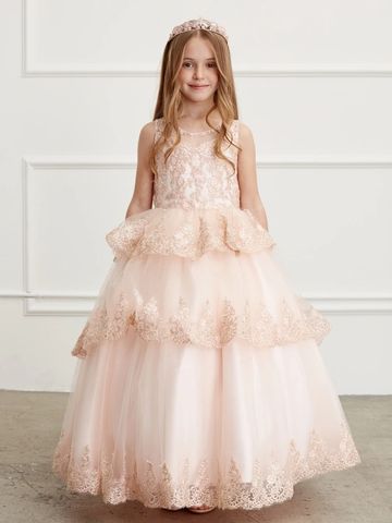 Elegant dress with rose gold lace detailing on the bodice and throughout its tulle-tiered skirt. Single button and criss-cross back with a pink ribbon to tie close. Even sizes only.